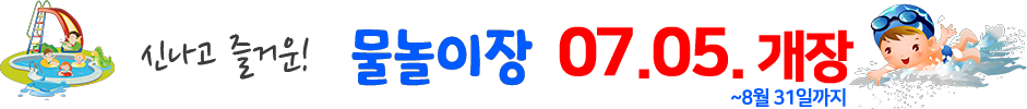 2023-08-03 금일 임시 운영 휴무 안내.. 충북혁신도시물놀이장은 호우로 인하여, 다음과 같이 운영을 잠시 중단합니다.운영 중단기간 : 07월 18일 ~ 07월 18일 까지오 픈 예 정 일 : 익일* 기상상황에 따라 변경될수 있습니다.더 좋은 서비스로 준비하여 찾아뵙겠습니다.감사합니다...